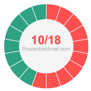 10/18 ist ein Bruch, der 10 von 18 bedeutet, und Prozent bedeutet etwas von 100. Wir können also die folgende Gleichung aufstellen, um 10/18 als Prozentzahl zu erhalten: