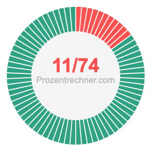 11/74 ist ein Bruch, der 11 von 74 bedeutet, und Prozent bedeutet etwas von 100. Wir können also die folgende Gleichung aufstellen, um 11/74 als Prozentzahl zu erhalten: