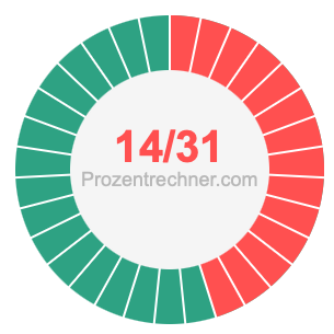 Was ist 14/31 in Prozent? Wie viel ist 14/31 in Prozent? Wie viel Prozent sind 14/31? Hier erklären und zeigen wir Ihnen, wie Sie 14/31 in Prozent berechnen und umrechnen können.