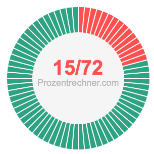 15/72 ist ein Bruch, der 15 von 72 bedeutet, und Prozent bedeutet etwas von 100. Wir können also die folgende Gleichung aufstellen, um 15/72 als Prozentzahl zu erhalten: