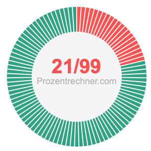 21/99 ist ein Bruch, der 21 von 99 bedeutet, und Prozent bedeutet etwas von 100. Wir können also die folgende Gleichung aufstellen, um 21/99 als Prozentzahl zu erhalten:
