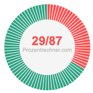 Was ist 29/87 in Prozent? Wie viel ist 29/87 in Prozent? Wie viel Prozent sind 29/87? Hier erklären und zeigen wir Ihnen, wie Sie 29/87 in Prozent berechnen und umrechnen können.