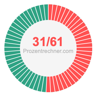 31/61 ist ein Bruch, der 31 von 61 bedeutet, und Prozent bedeutet etwas von 100. Wir können also die folgende Gleichung aufstellen, um 31/61 als Prozentzahl zu erhalten: