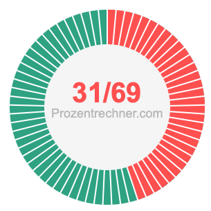 31/69 ist ein Bruch, der 31 von 69 bedeutet, und Prozent bedeutet etwas von 100. Wir können also die folgende Gleichung aufstellen, um 31/69 als Prozentzahl zu erhalten: