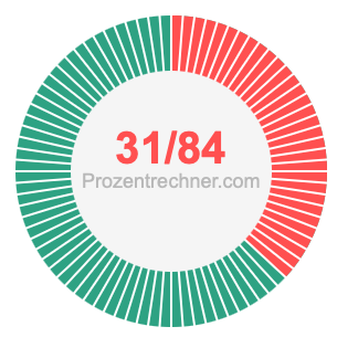 31/84 ist ein Bruch, der 31 von 84 bedeutet, und Prozent bedeutet etwas von 100. Wir können also die folgende Gleichung aufstellen, um 31/84 als Prozentzahl zu erhalten: