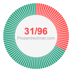31/96 ist ein Bruch, der 31 von 96 bedeutet, und Prozent bedeutet etwas von 100. Wir können also die folgende Gleichung aufstellen, um 31/96 als Prozentzahl zu erhalten: