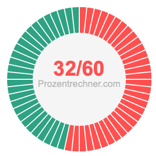Was ist 32/60 in Prozent? Wie viel ist 32/60 in Prozent? Wie viel Prozent sind 32/60? Hier erklären und zeigen wir Ihnen, wie Sie 32/60 in Prozent berechnen und umrechnen können.