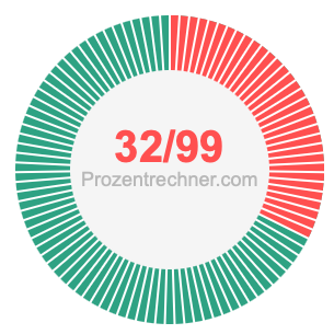 Was ist 32/99 in Prozent? Wie viel ist 32/99 in Prozent? Wie viel Prozent sind 32/99? Hier erklären und zeigen wir Ihnen, wie Sie 32/99 in Prozent berechnen und umrechnen können.