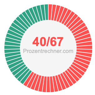 Was ist 40/67 in Prozent? Wie viel ist 40/67 in Prozent? Wie viel Prozent sind 40/67? Hier erklären und zeigen wir Ihnen, wie Sie 40/67 in Prozent berechnen und umrechnen können.
