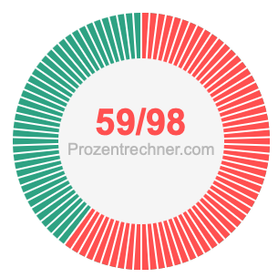 Was ist 59/98 in Prozent? Wie viel ist 59/98 in Prozent? Wie viel Prozent sind 59/98? Hier erklären und zeigen wir Ihnen, wie Sie 59/98 in Prozent berechnen und umrechnen können.