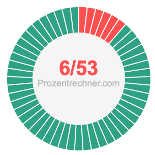 Was ist 6/53 in Prozent? Wie viel ist 6/53 in Prozent? Wie viel Prozent sind 6/53? Hier erklären und zeigen wir Ihnen, wie Sie 6/53 in Prozent berechnen und umrechnen können.