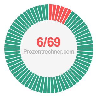 6/69 ist ein Bruch, der 6 von 69 bedeutet, und Prozent bedeutet etwas von 100. Wir können also die folgende Gleichung aufstellen, um 6/69 als Prozentzahl zu erhalten: