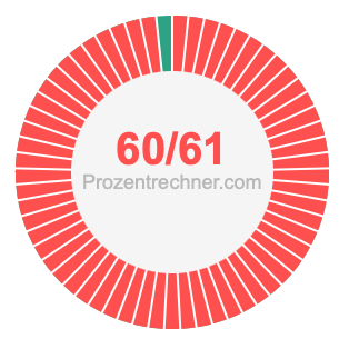 Was ist 60/61 in Prozent? Wie viel ist 60/61 in Prozent? Wie viel Prozent sind 60/61? Hier erklären und zeigen wir Ihnen, wie Sie 60/61 in Prozent berechnen und umrechnen können.