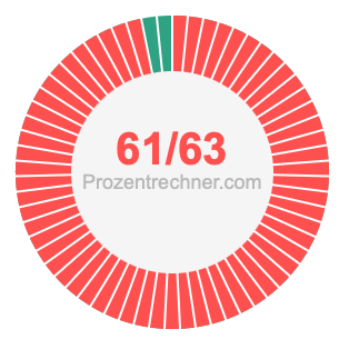 Was ist 61/63 in Prozent? Wie viel ist 61/63 in Prozent? Wie viel Prozent sind 61/63? Hier erklären und zeigen wir Ihnen, wie Sie 61/63 in Prozent berechnen und umrechnen können.