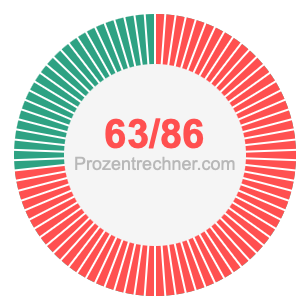 63/86 ist ein Bruch, der 63 von 86 bedeutet, und Prozent bedeutet etwas von 100. Wir können also die folgende Gleichung aufstellen, um 63/86 als Prozentzahl zu erhalten: