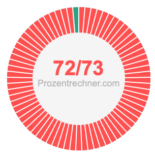 Was ist 72/73 in Prozent? Wie viel ist 72/73 in Prozent? Wie viel Prozent sind 72/73? Hier erklären und zeigen wir Ihnen, wie Sie 72/73 in Prozent berechnen und umrechnen können.