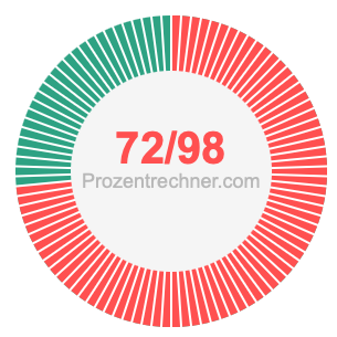 Was ist 72/98 in Prozent? Wie viel ist 72/98 in Prozent? Wie viel Prozent sind 72/98? Hier erklären und zeigen wir Ihnen, wie Sie 72/98 in Prozent berechnen und umrechnen können.