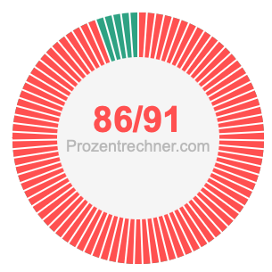 Was ist 86/91 in Prozent? Wie viel ist 86/91 in Prozent? Wie viel Prozent sind 86/91? Hier erklären und zeigen wir Ihnen, wie Sie 86/91 in Prozent berechnen und umrechnen können.